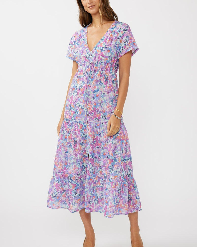 Floral V-Neck Maxi Dress - Light Blue/Plum- FINAL SALE