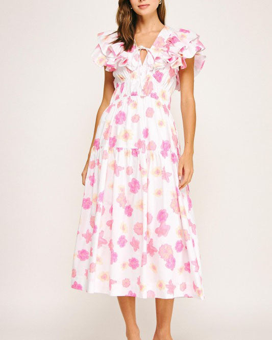 Ruffle Detail Floral Midi Dress - Pink - FINAL SALE