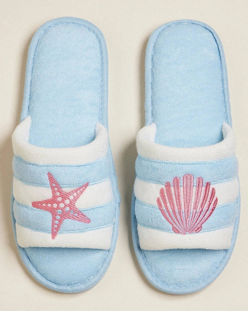 Sea Shell & Starfish Embroidered Terry Slides - Blue - FINAL SALE
