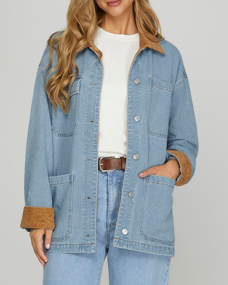 Denim Barn Jacket with Contrast Collar - Light Blue