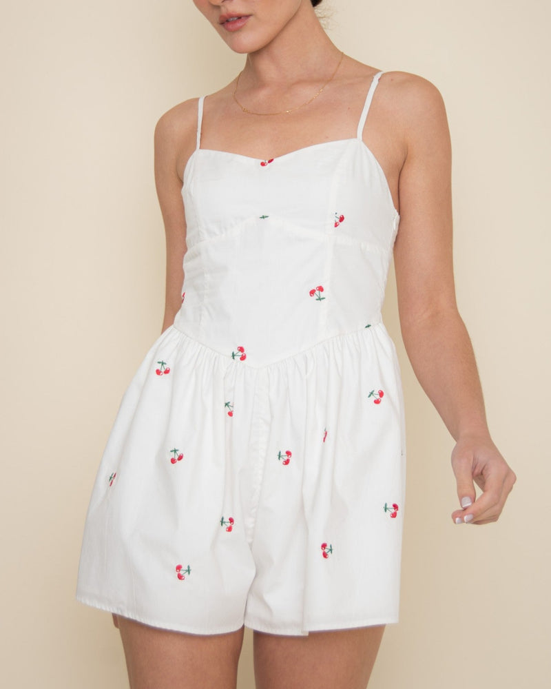 Embroidered Cotton Cami Romper - White/Red - FINAL SALE