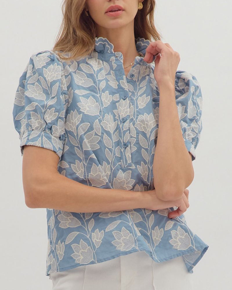 Embroidered Puff Sleeve Top - Navy - FINAL SALE