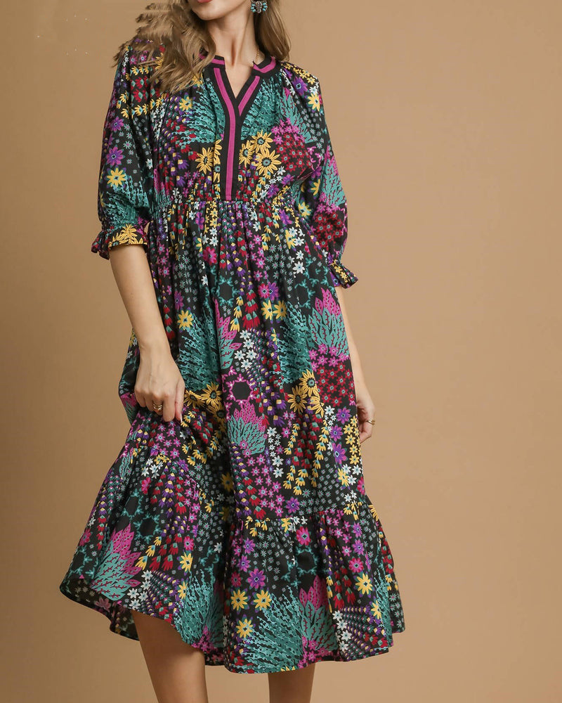 Floral Midi Dress with Ric Rac Trim - Black - FINAL SALE