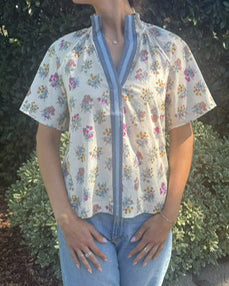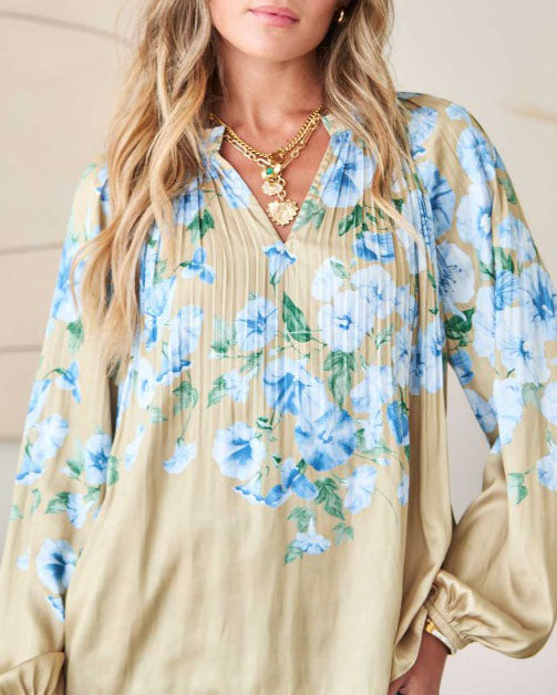Floral Pleated Blouse - Light Olive/Blue Multi - FINAL SALE