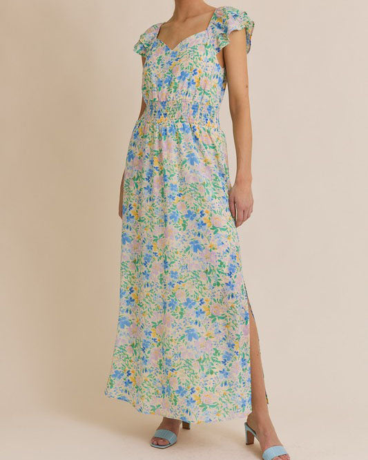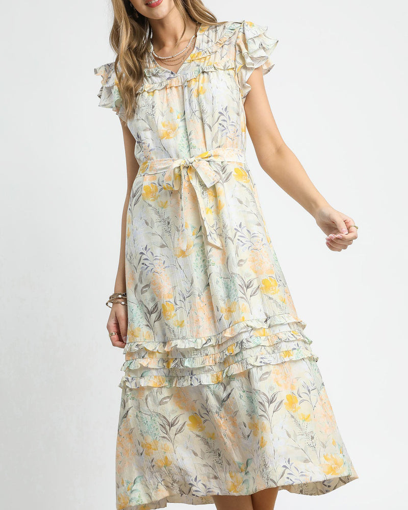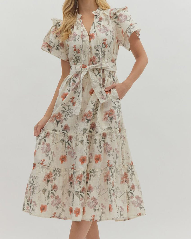 Floral Midi Dress with Flutter Sleeves - Ecru