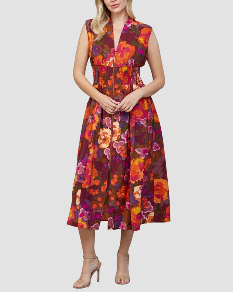 Front Zip Print Midi Dress - Multi