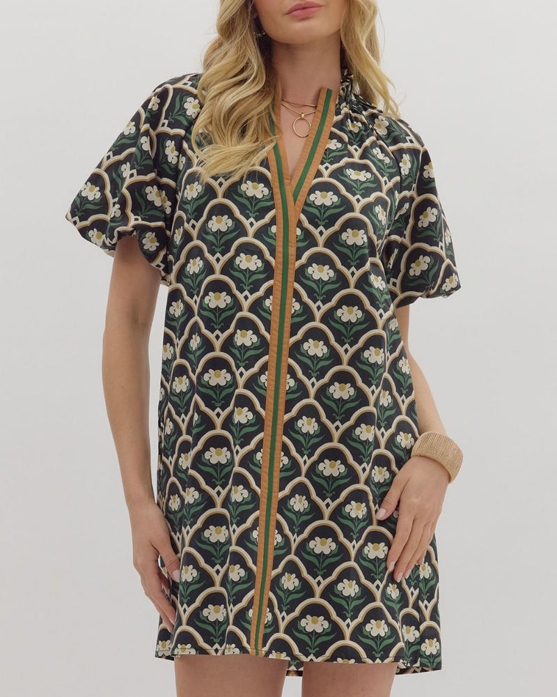 Botanical Print Mini Dress - Black