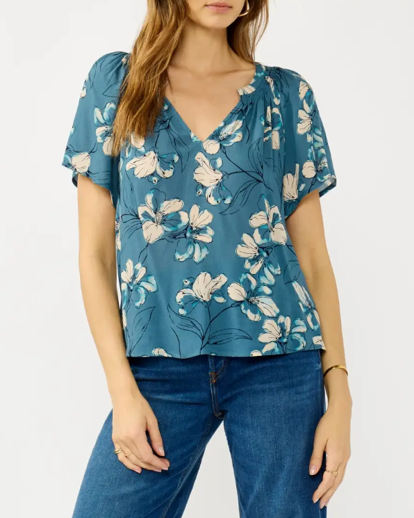 Split Neck Top with Short Sleeves - Teal/Blue
