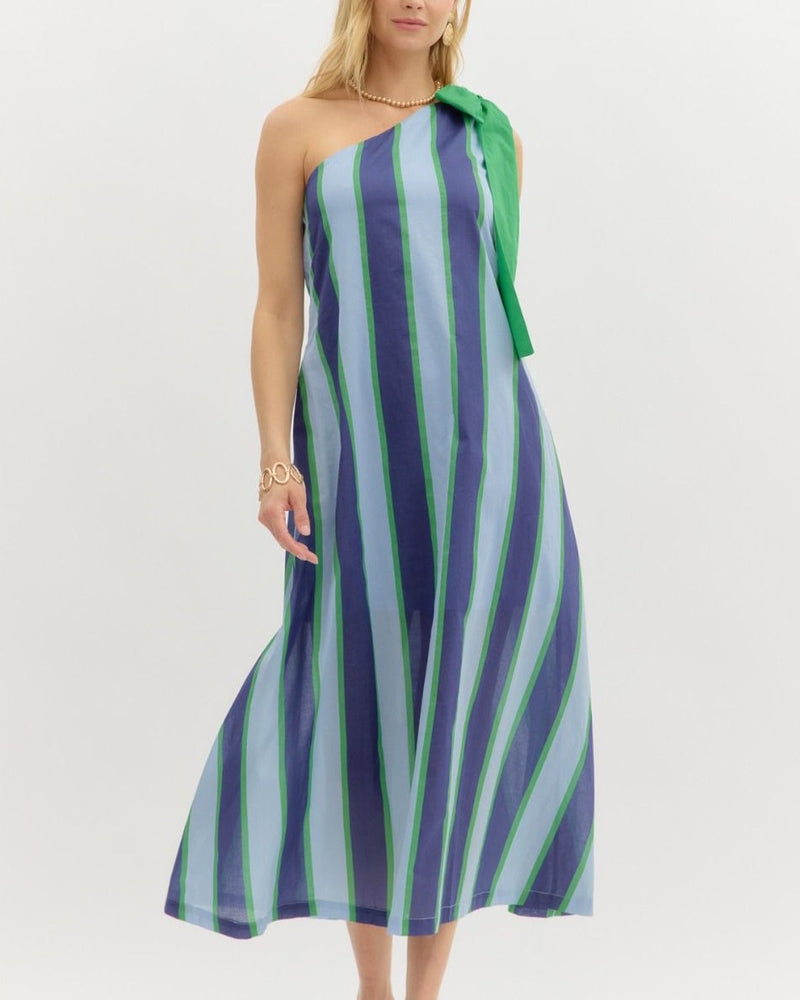 Stripe One Shoulder Dress with Bow Tie at Shoulder - Blue Green - FINAL SALE