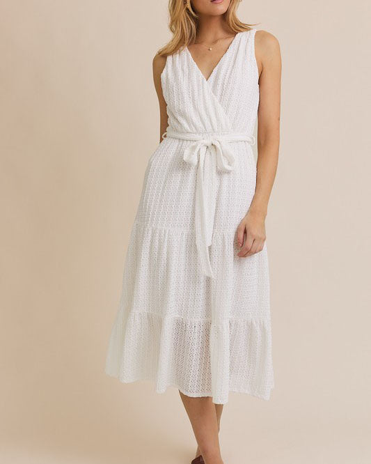 Surplice Waist Tie Eyelet Midi Dress - White - FINAL SALE