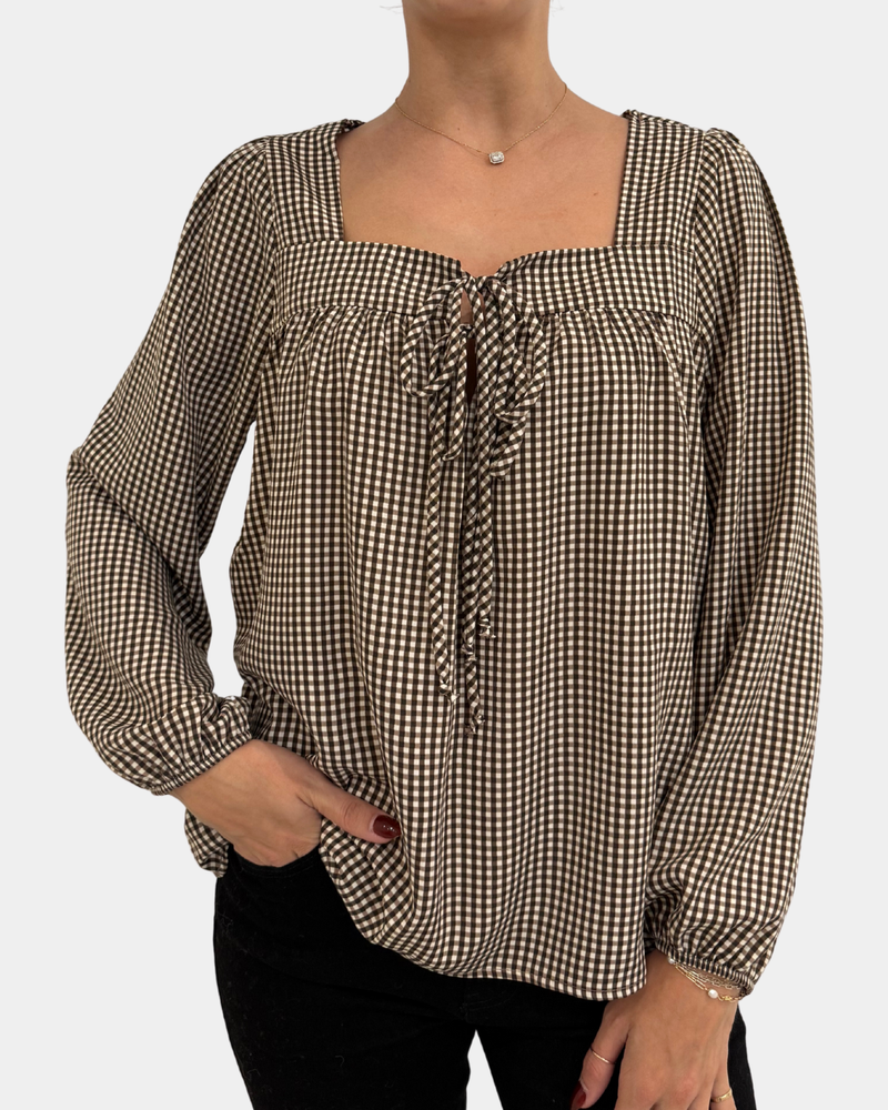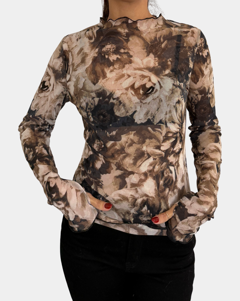 Long Sleeve Floral Mesh Top - Taupe/Black