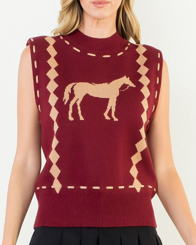 Sleeveless Horse Knit Vest Top - Burgundy