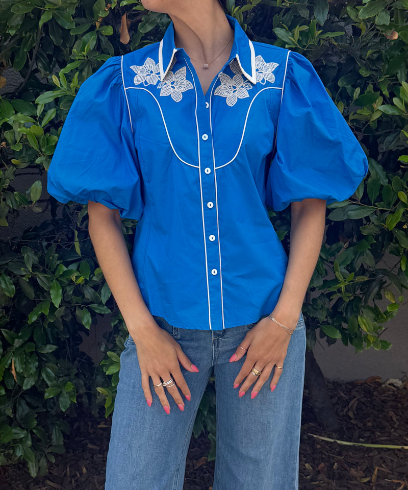 Puff Sleeve Flower Embroidered Top - Blue - FINAL SALE