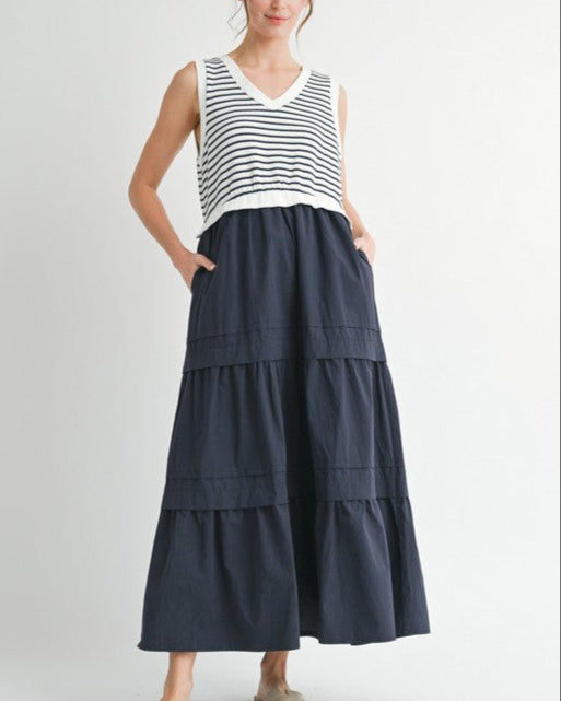Mixed Fabric Tiered Maxi Dress - Navy - FINAL SALE