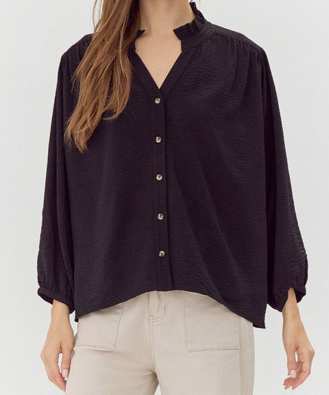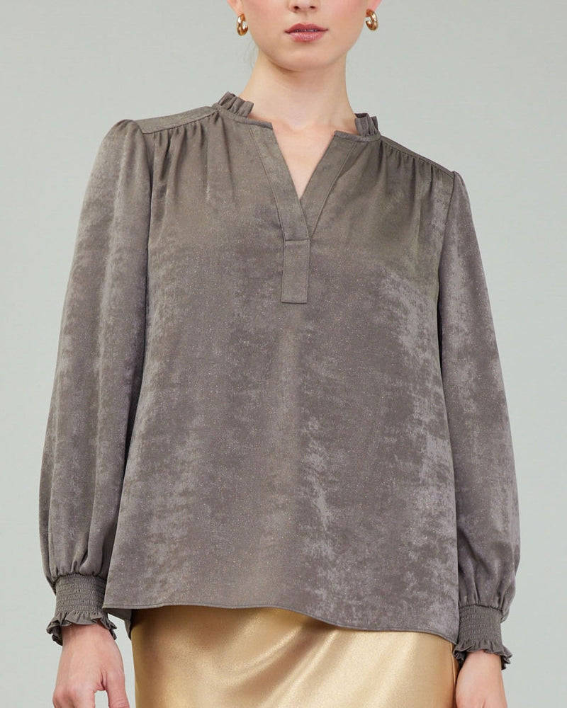 Ruffled Split Neck Blouse - Dark Olive - FINAL SALE