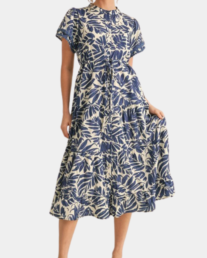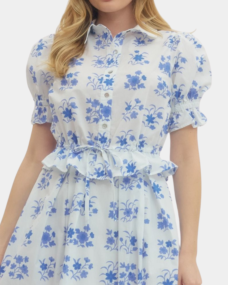 Printed Drawstring Waist Dress - Blue
