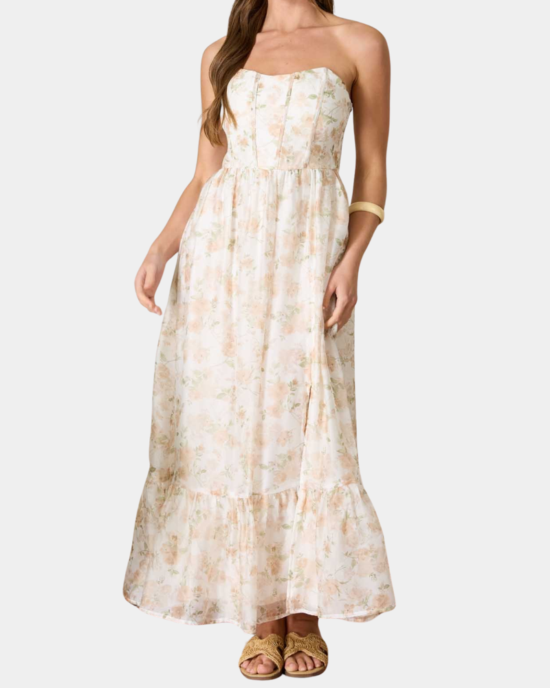 Floral Strapless Corset Dress - Light Khaki/Multi