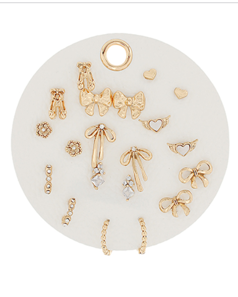 Pave Dome and Bow Earrings, Set of 7 - Gold/Clear