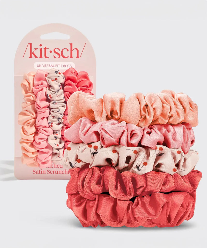 Ruched Satin Scrunchies, 5pc Set - Assorted Cherry Blossom