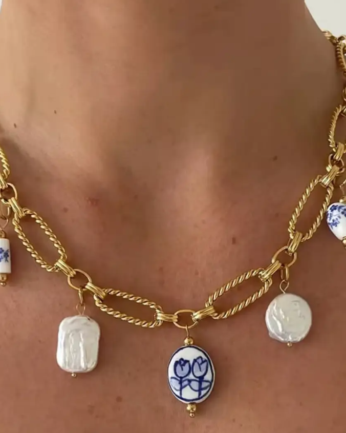 Blue Floral & Pearl Charm Necklace - Gold - FINAL SALE