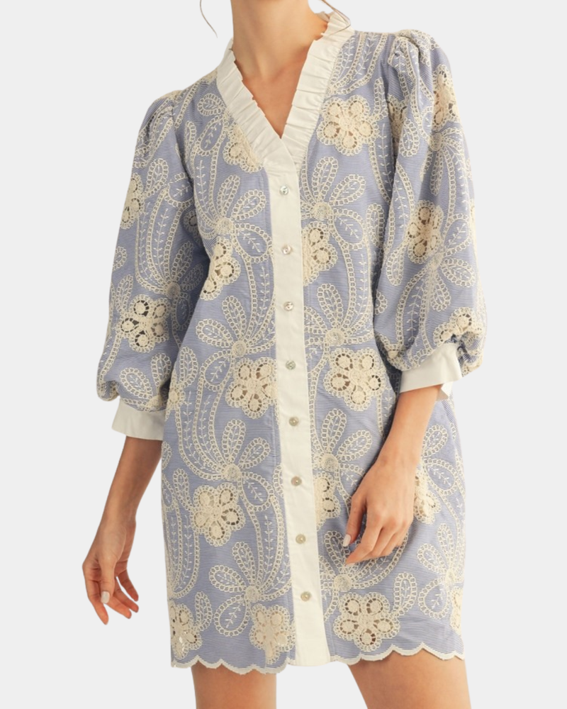 Floral Embroidered Mini Dress - Blue