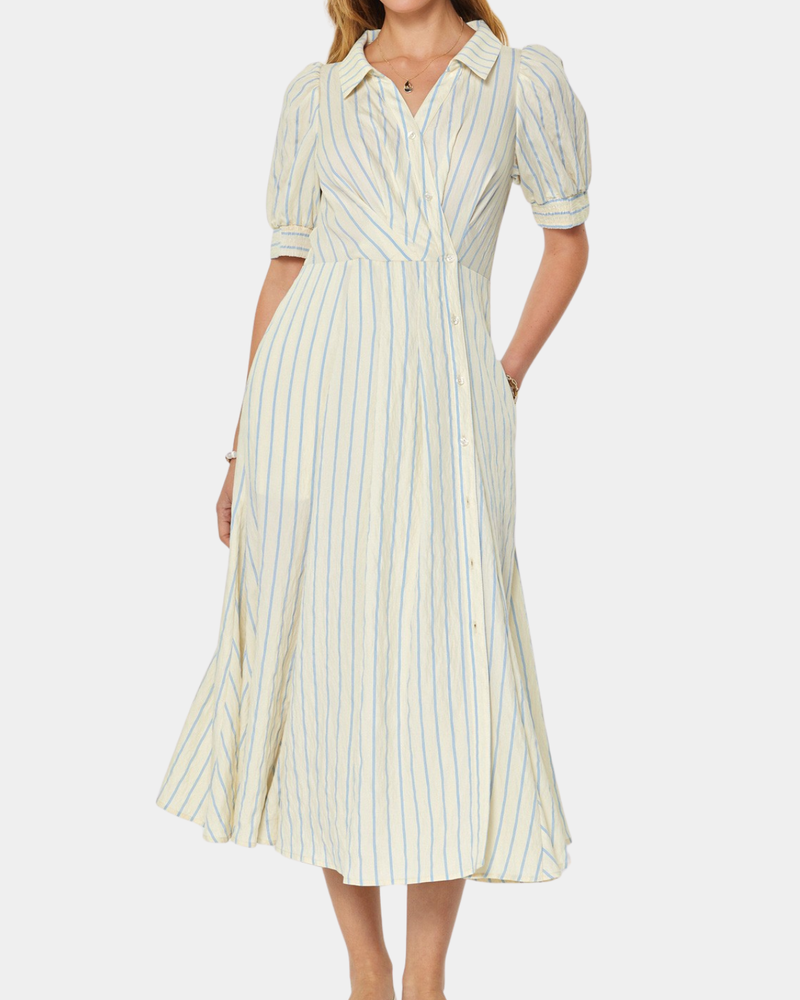 Striped Shirt Collar Dress - Ivory/Blue