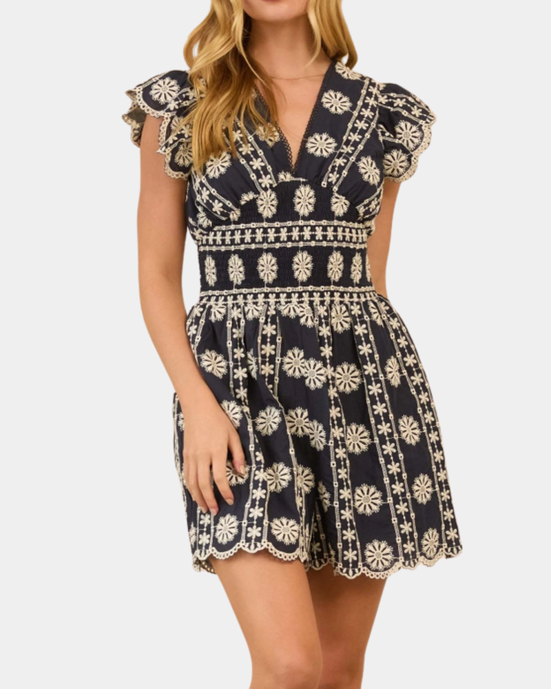 Embroidered Easy Romper - Navy/White