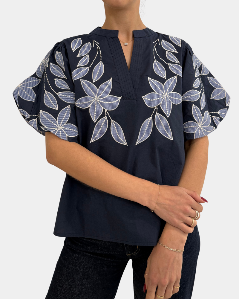 Puff Sleeve Embroidered Top - Navy