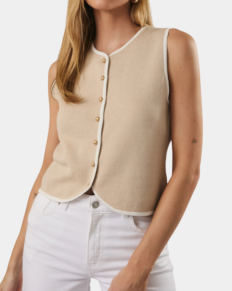Sleeveless Button Vest - Beige/White