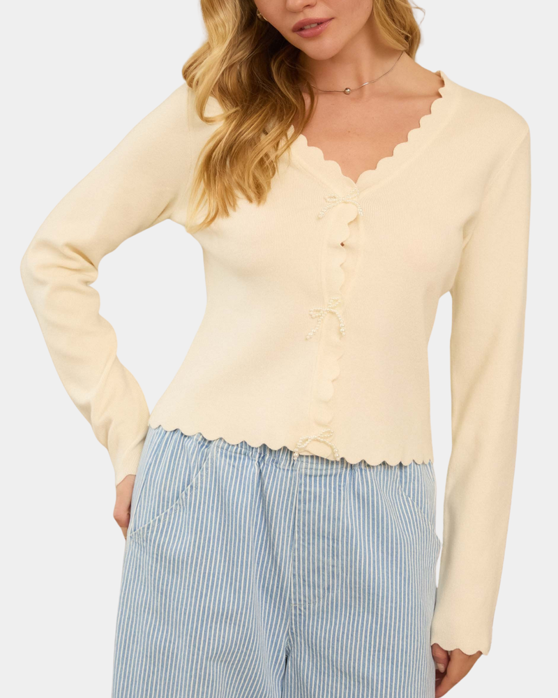 Scalloped Cardigan with Pearl Bow - Ivory