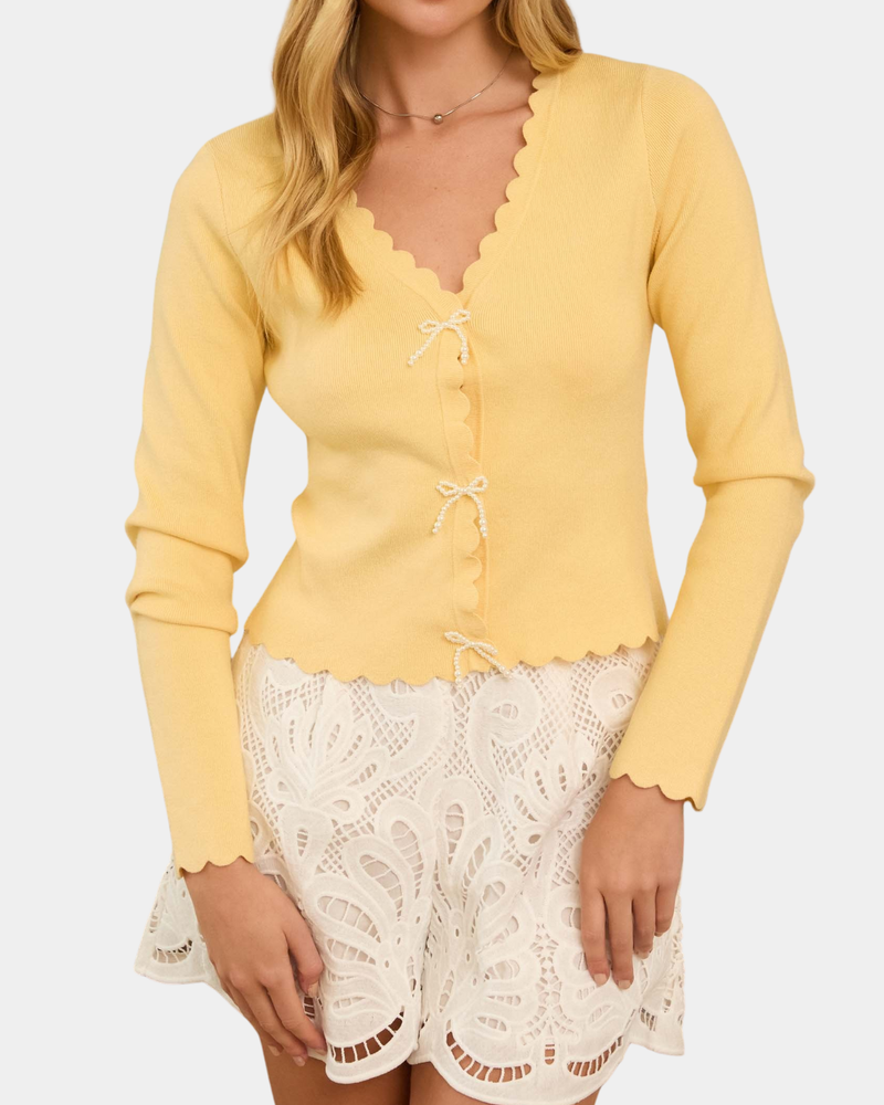 Scalloped Cardigan with Pearl Bow - Butter Yellow