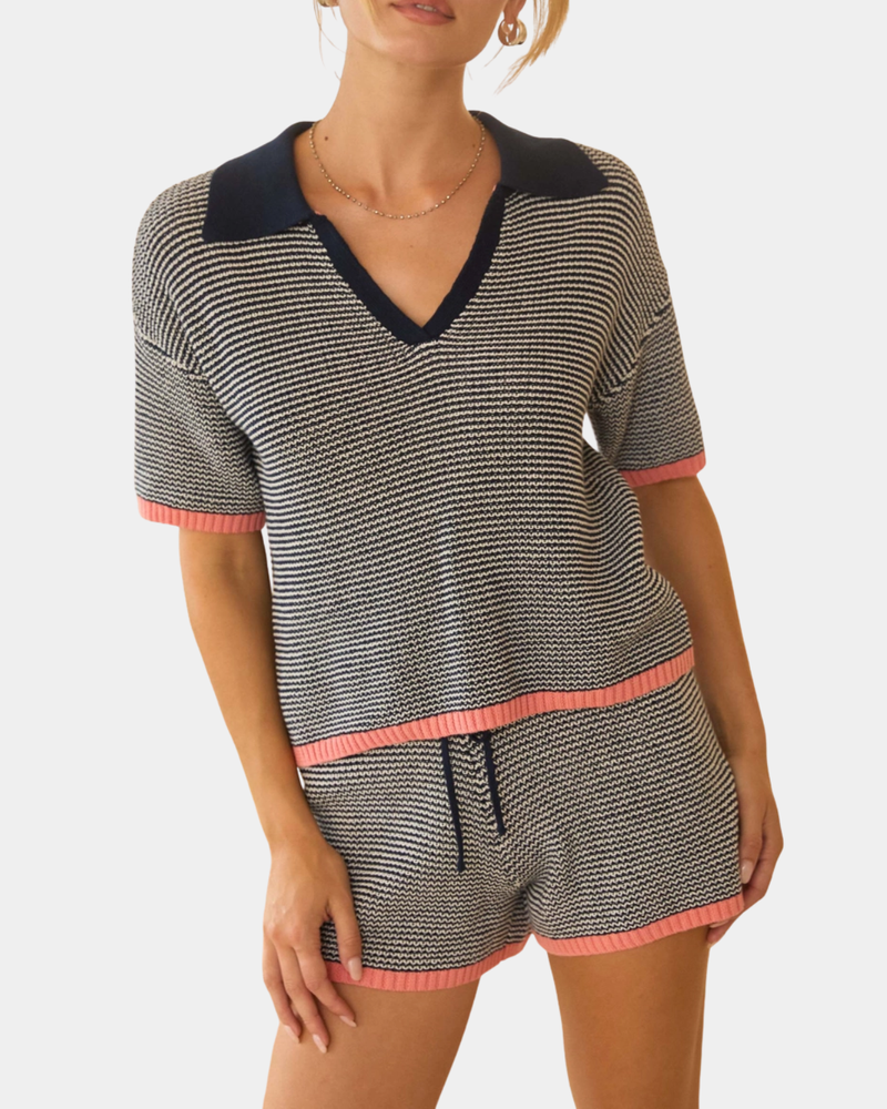 Striped Polo Collar Top - Navy/Peach