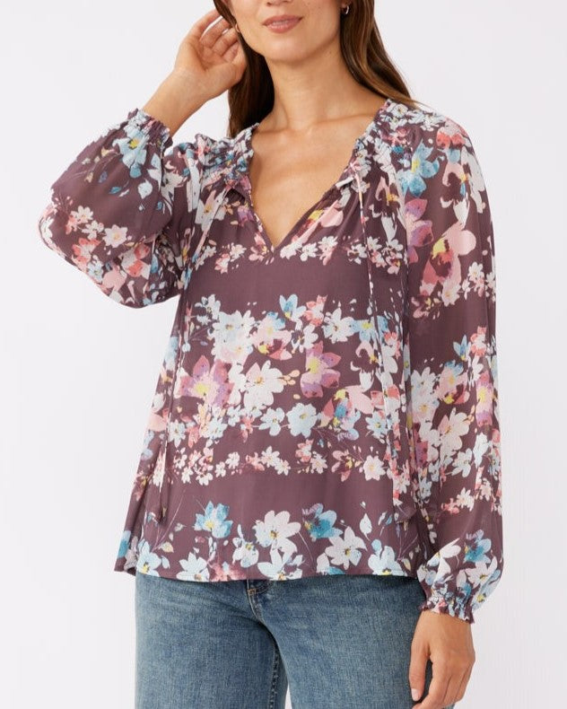 Smocked Neck Floral Chiffon Top - Plum/Blue - FINAL SALE