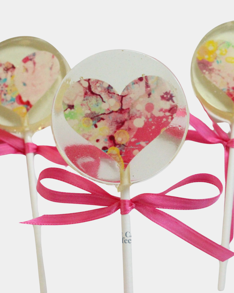 Handcrafted lollipops featuring one-of-a-kind watercolor hearts suspended in shimmering clear candy. Each design is uniquely gorgeous and completely edible. Vegan, gluten-free, dairy-free, and nut-free—a sweet treat for everyone!