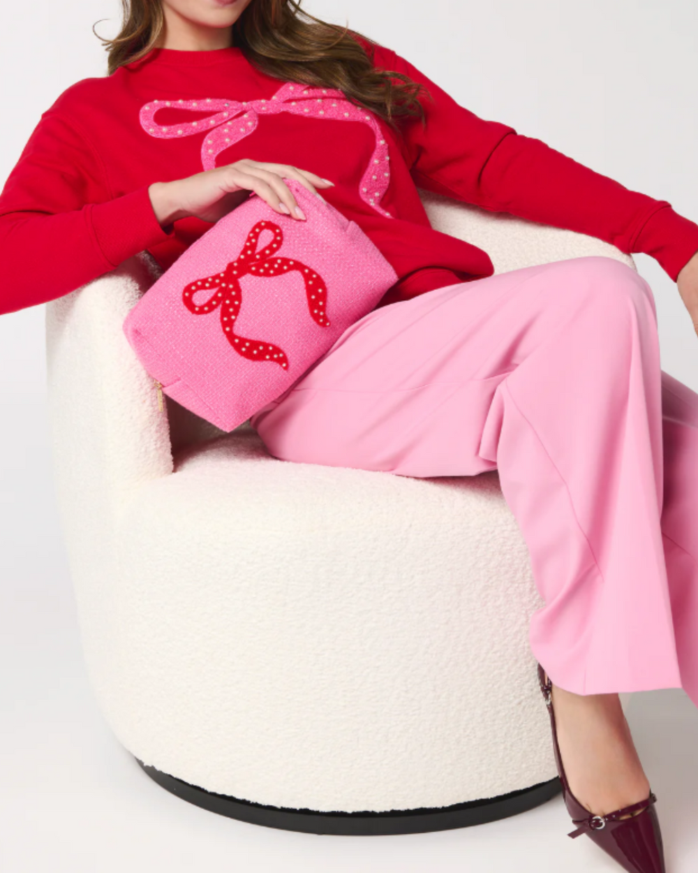 Make a splash with the Mara Bow Large Zip Pouch, wrapped in bright pink woven fabric and topped with a fun red polka dot bow. Its roomy interior and secure zip closure make it perfect for carrying all your beauty essentials with a pop of playful charm.