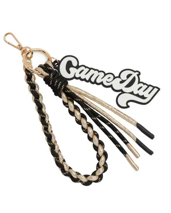 Show off your team spirit in style with the Game Day Bag Charm/Key Ring! Featuring braided cords in vibrant black and god, a playful "Game Day" tag, and a mix of textured tassels, this charm adds instant personality to your favorite bag. The gold-tone key ring and easy clasp hook make it a breeze to attach to any purse, tote, or backpack. Whether you're tailgating or just out running errands, this accessory is here to cheer you on!.