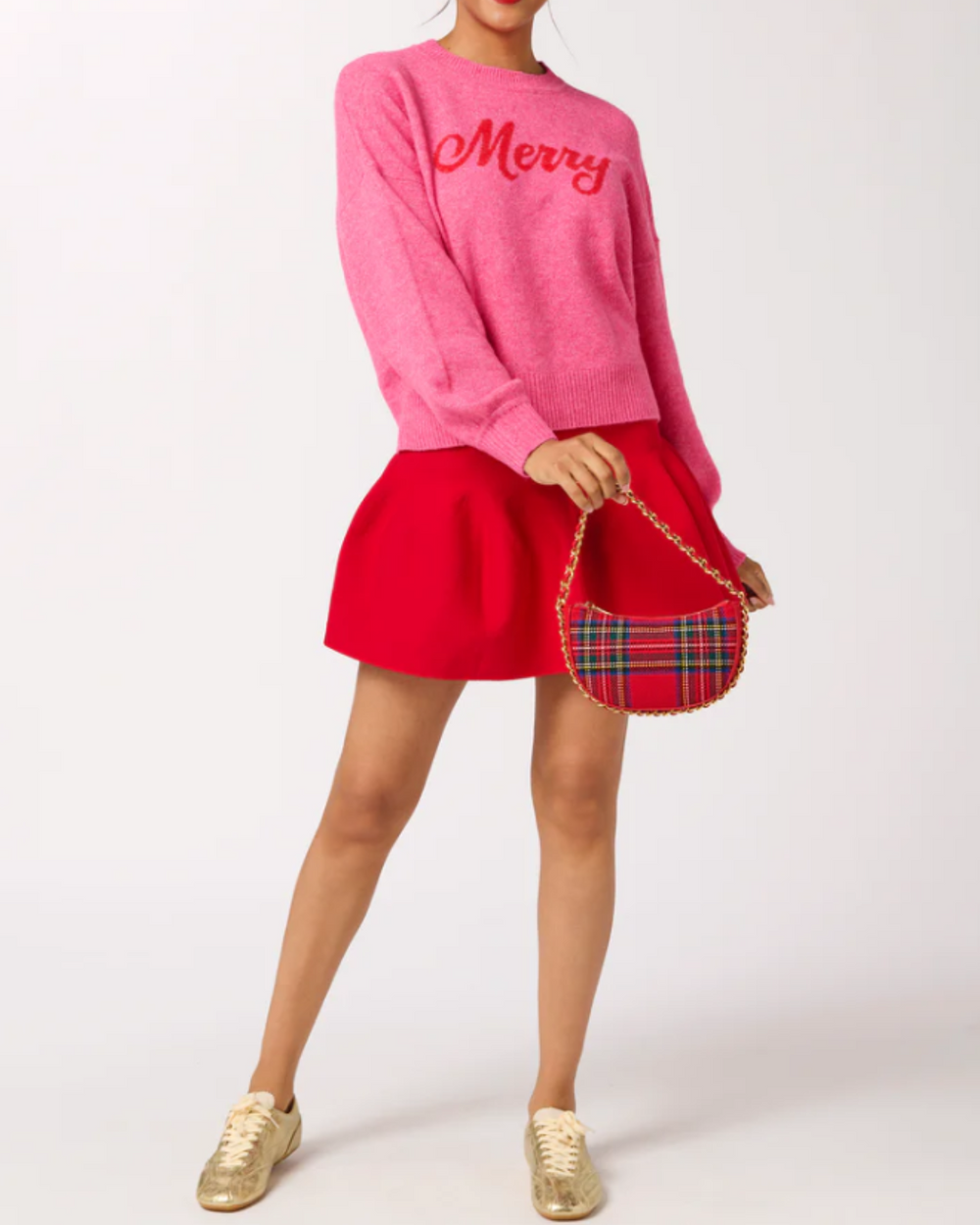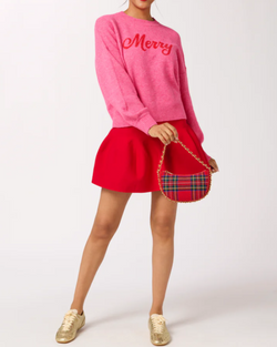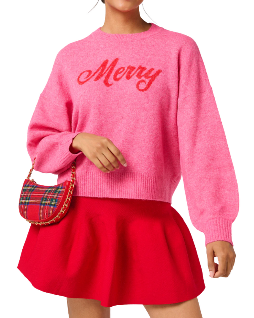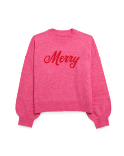 The “Merry” Sweater brings instant holiday joy with its cozy pink knit and bright red “Merry” script. Its relaxed fit and classic crew neck make it perfect for wrapping presents or raising a glass at your festive gatherings—just add a plaid skirt or some sparkle to complete the fun look.