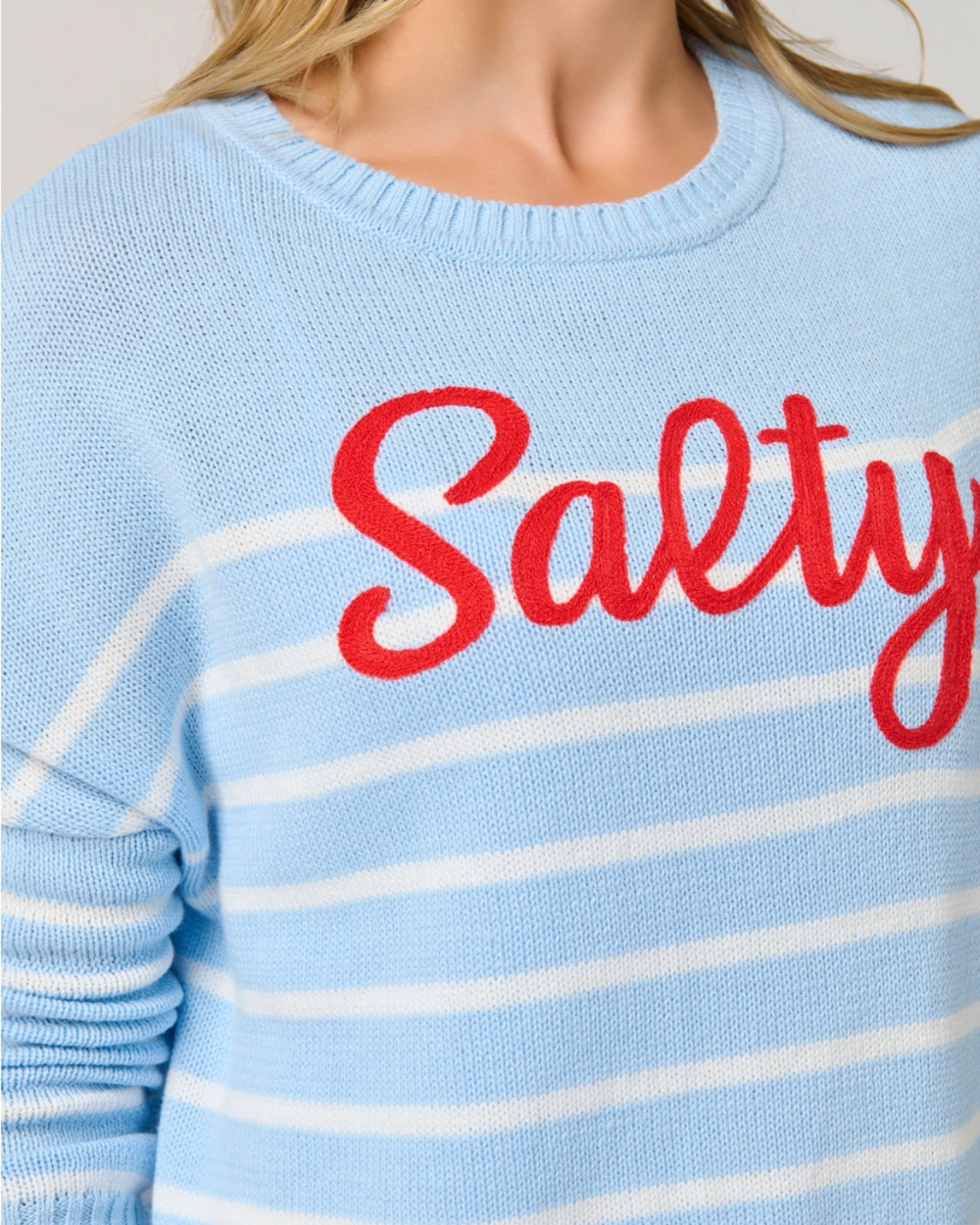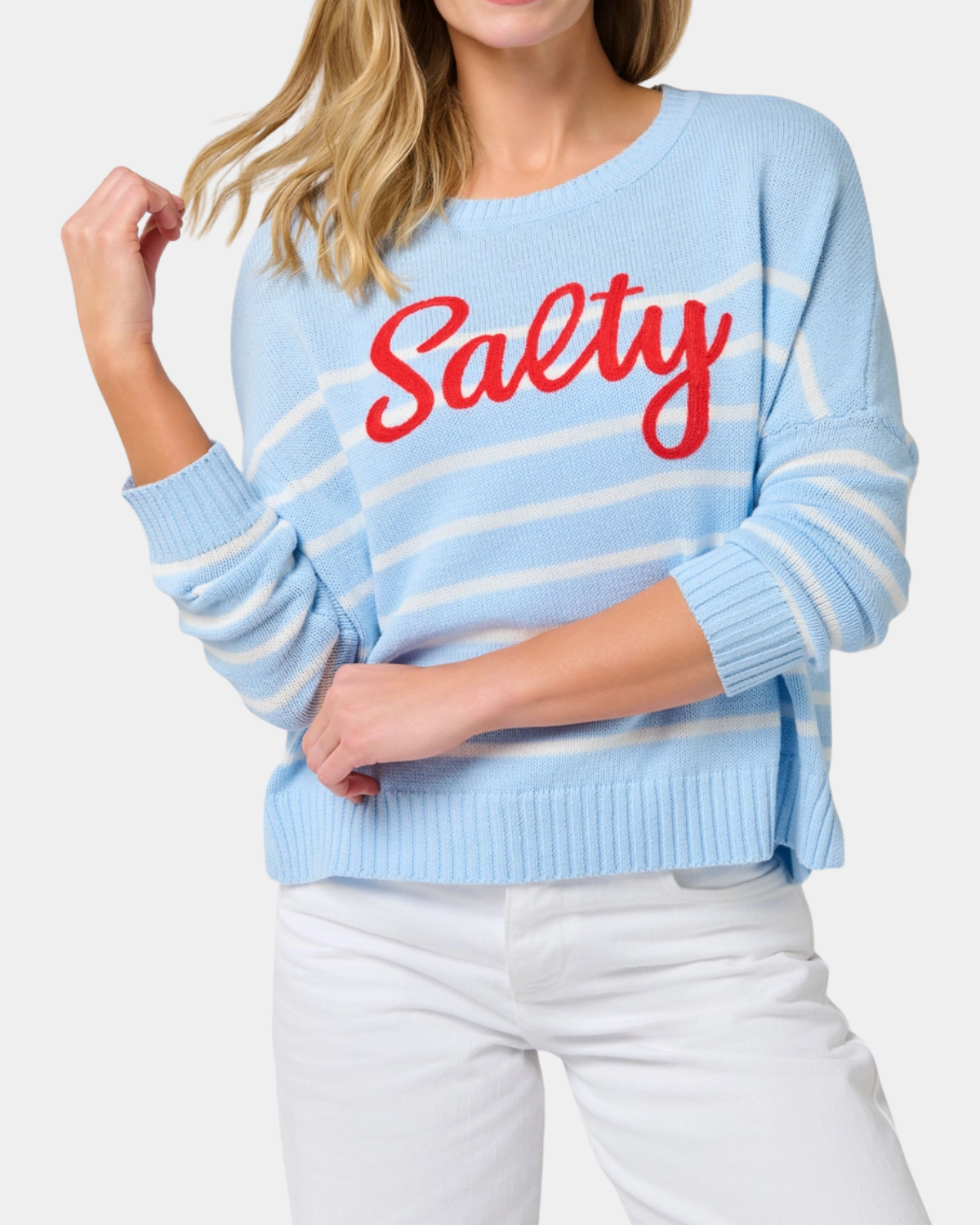 Meet your new favorite layer. The Salty Sweater Top in blue features a relaxed fit that plays well with everything, plus hassle-free care that keeps up with your lifestyle.