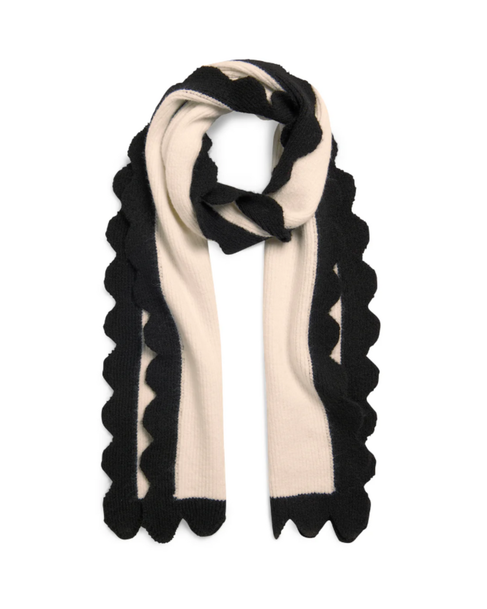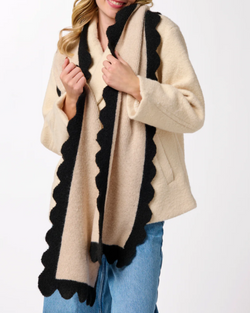 Snuggle up in the Melody Scarf, complete with charming scalloped edges and fun color blocking that matches its beanie buddy. This oversized knit brings cozy comfort and a pop of personality to any winter outfit.