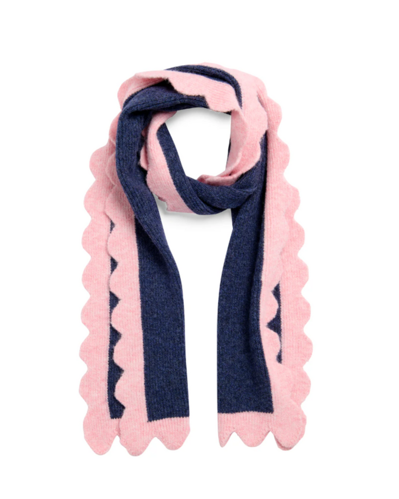 Snuggle up in the Melody Scarf, complete with charming scalloped edges and fun color blocking that matches its beanie buddy. This oversized knit brings cozy comfort and a pop of personality to any winter outfit.