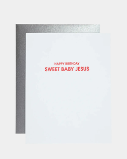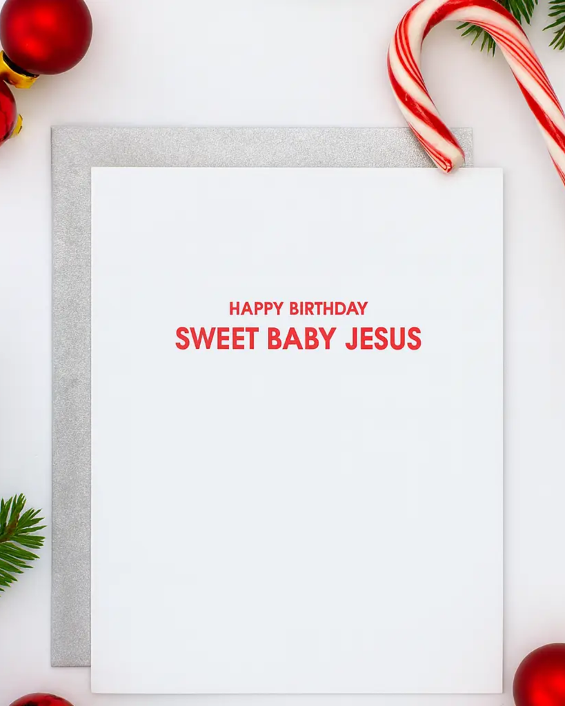 Add some cheeky charm to your holidays with our “Happy Birthday Sweet Baby Jesus” card, letterpress printed on a vintage press in California. Featuring bold red ink on crisp white paper and paired with a silver envelope, it’s perfect for anyone who loves a humorous holiday greeting.