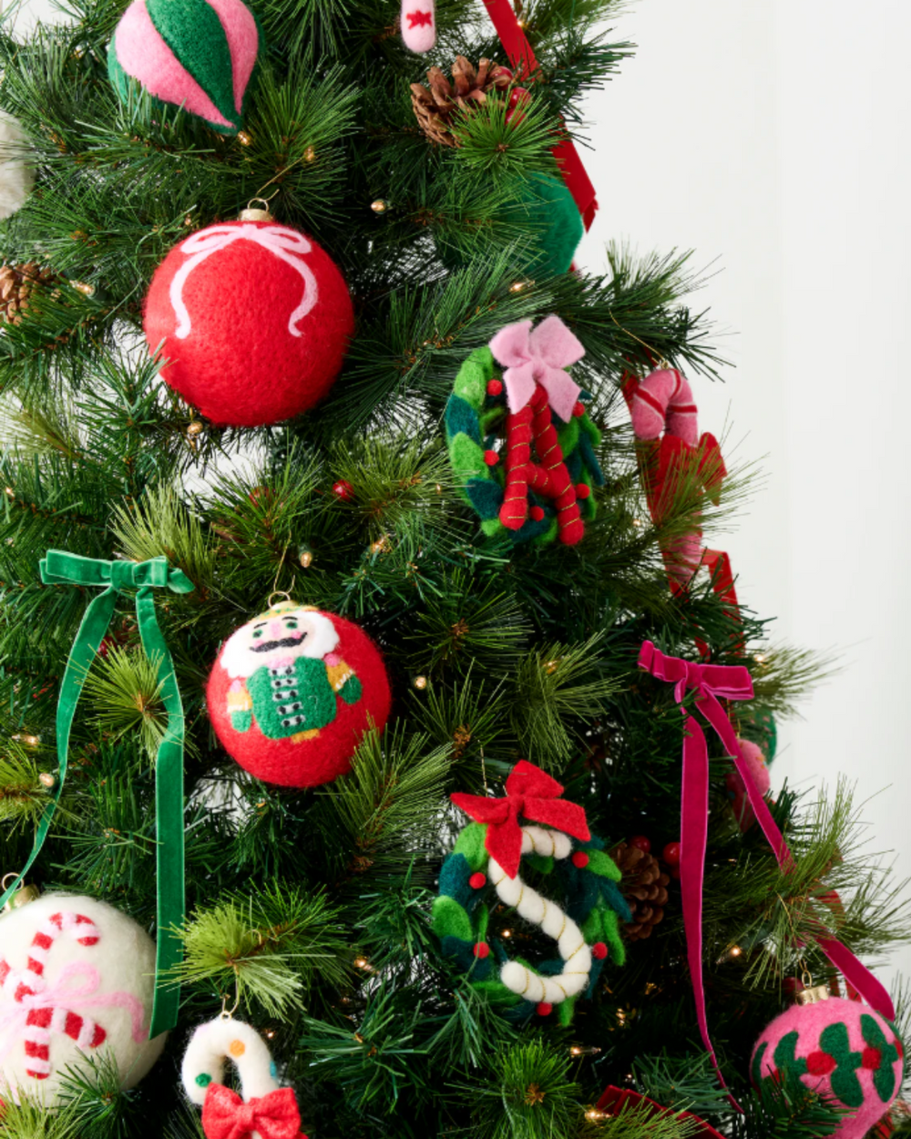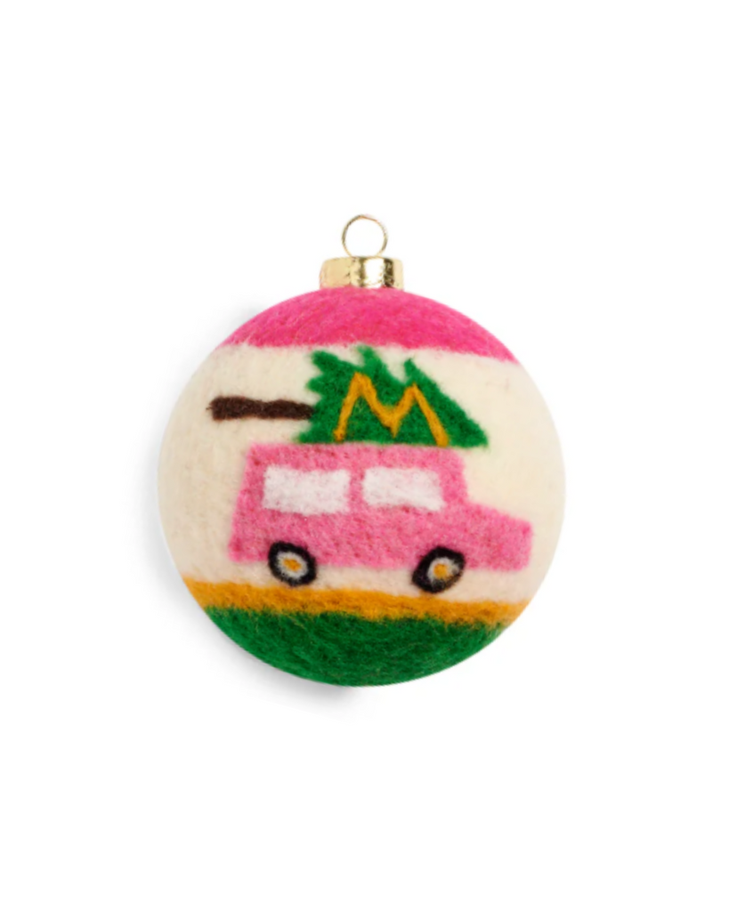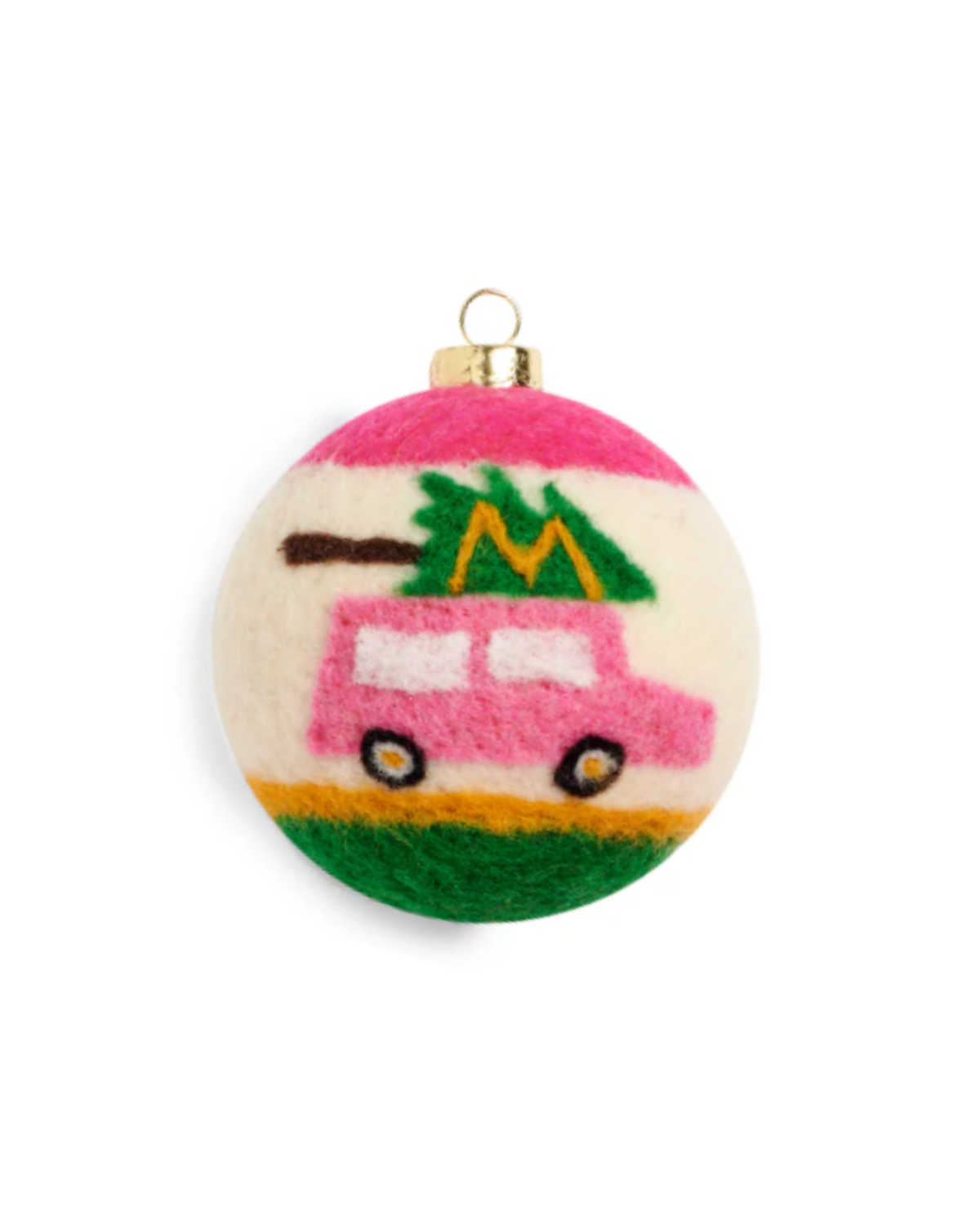 Add a splash of joy to your holiday tree with these festive hand-felted ornament featuring bright colors, fun retro stripes, and an adorable pink car carrying a tree. With charming bow details and a lightweight feel, these ornaments bring a warm, cheerful vibe that’s perfect for gifting or your own holiday fun.