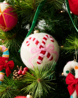 Bring festive fun to your tree with the Candy Cane Assorted Set of 4 Ornaments, featuring a jolly nutcracker, candy canes tied with a pink bow, and two colorful, classic shapes. Each handmade felt piece is full of personality and charm. Perfect for decking your tree or gifting holiday cheer!