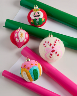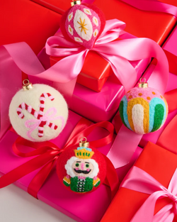 Bring festive fun to your tree with the Candy Cane Assorted Set of 4 Ornaments, featuring a jolly nutcracker, candy canes tied with a pink bow, and two colorful, classic shapes. Each handmade felt piece is full of personality and charm. Perfect for decking your tree or gifting holiday cheer!