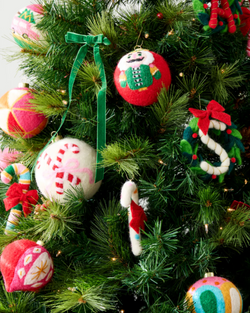 Bring festive fun to your tree with the Candy Cane Assorted Set of 4 Ornaments, featuring a jolly nutcracker, candy canes tied with a pink bow, and two colorful, classic shapes. Each handmade felt piece is full of personality and charm. Perfect for decking your tree or gifting holiday cheer!