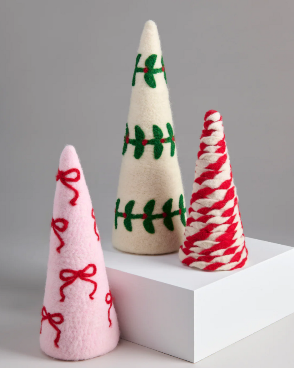 Sprinkle holiday magic with this adorable set of three Festive Bow Decorative Trees, featuring a soft pink tree dotted with red bows, a cream tree adorned with classic holly leaves, and a candy cane–striped design bursting with festive fun. Ideal for mantels, entryways, or tabletops, these cozy, cone-shaped trees add a playful pop of color and charm to any space.