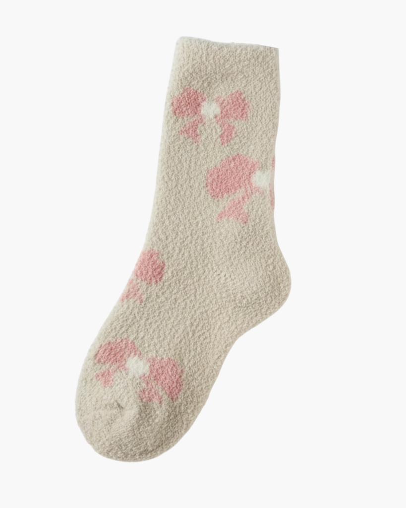 Wrap your feet in softness with these adorable Bow Pattern Cozy Socks. Made from plush, high-pile material with a gentle stretch, they deliver warmth and a snug fit perfect for lounging at home. Cute, cozy, and ideal for gifting—these socks are your new favorite comfort essential.