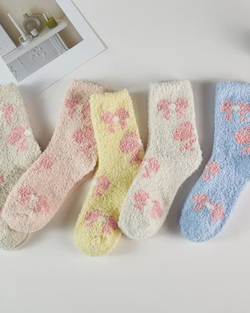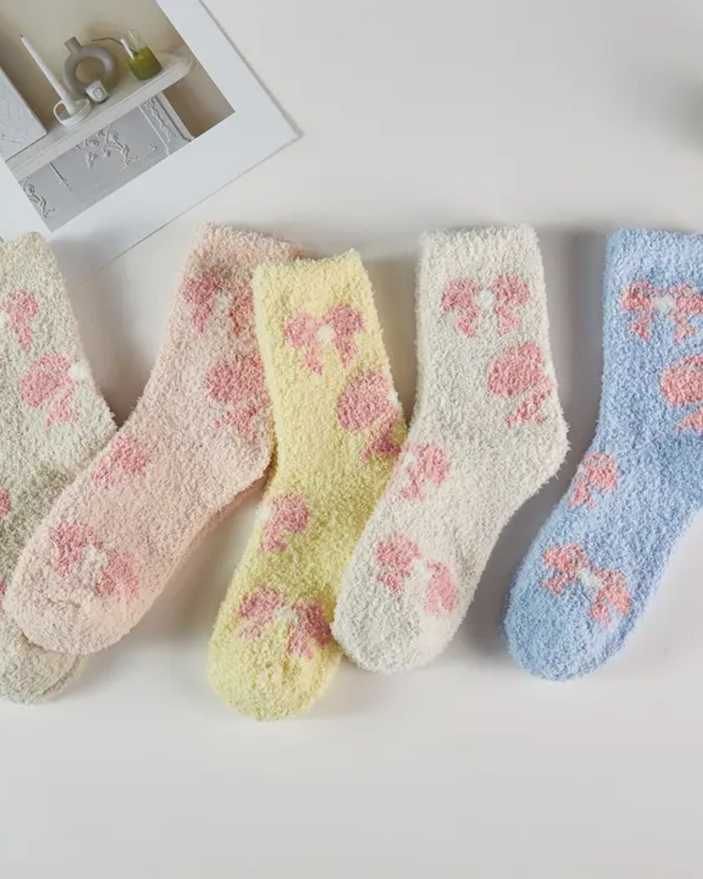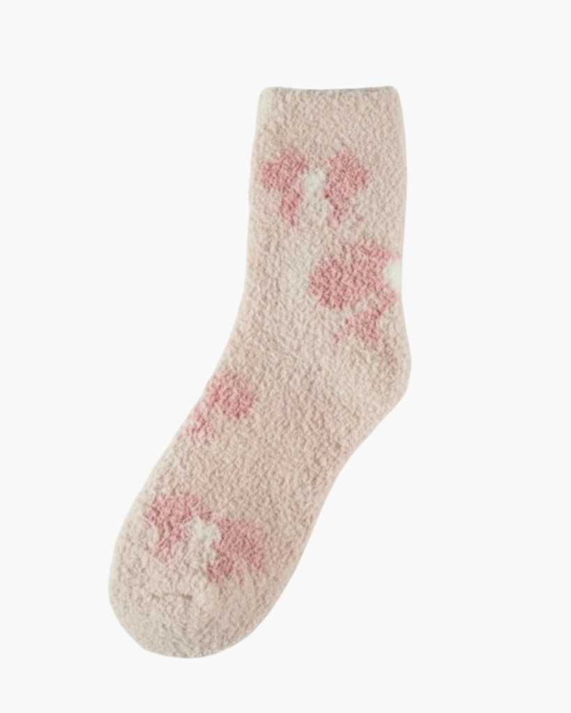 Wrap your feet in softness with these adorable Bow Pattern Cozy Socks. Made from plush, high-pile material with a gentle stretch, they deliver warmth and a snug fit perfect for lounging at home. Cute, cozy, and ideal for gifting—these socks are your new favorite comfort essential.