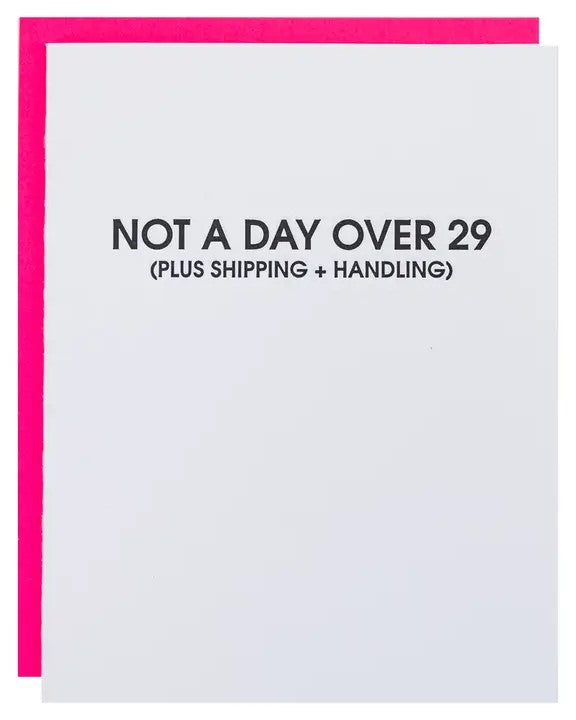 Celebrate in style with our Letterpress Card - Not A Day Over 29! Show your loved ones that aging is just a number with this quirky and playful card. Perfect for birthdays or any special occasion, this card will bring a smile to anyone's face.