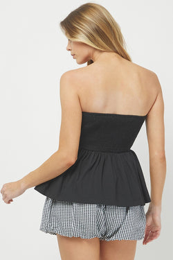 Flirty strapless top with pleated detailing and a fun bubbled peplum that adds instant personality. Perfect for date night or turning heads at your next event.